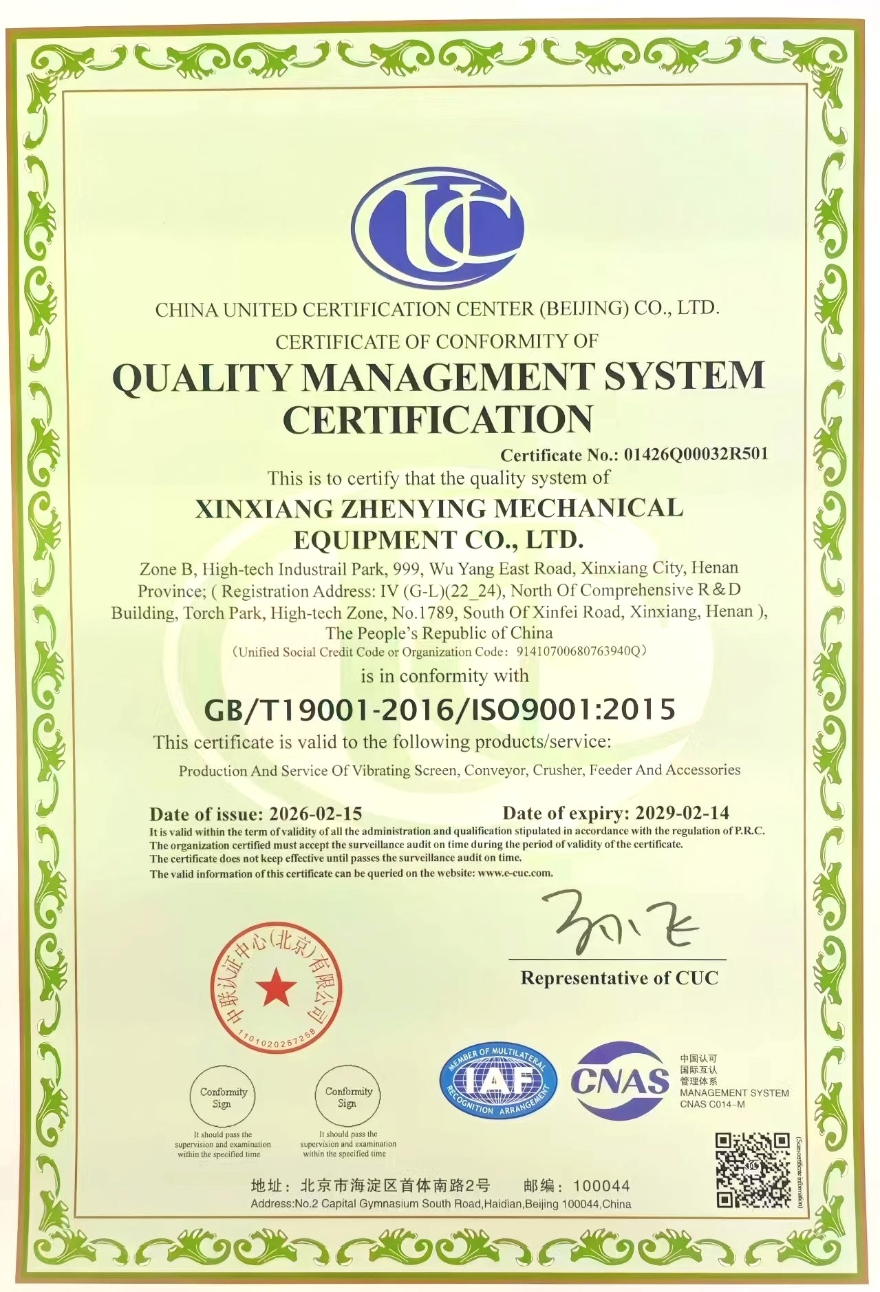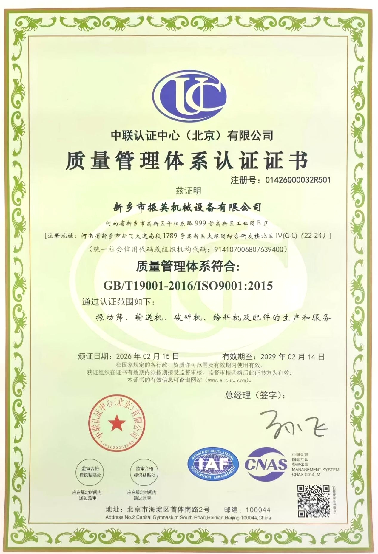 質量體系認證證書
